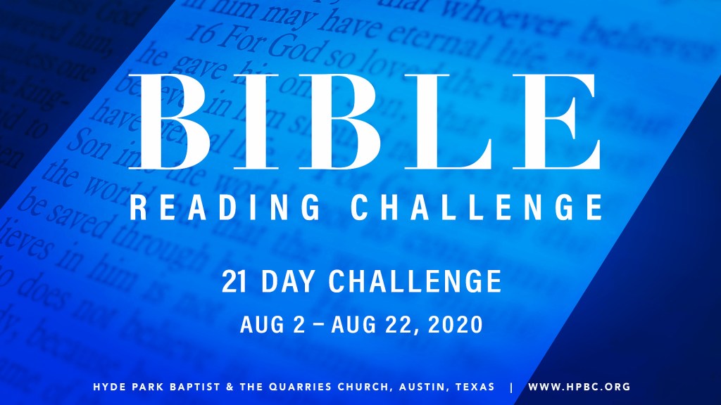 During the Covid-19 Global Pandemic millions of Americans have stopped reading the Bible! ( https://www.sltrib.com/religion/2020/07/22/pandemic-has-people/) In response to this development, at Hyde Park Baptist and The Quarries Church in Austin, Texas, I have issued the BIBLE READING CHALLENGE 2020. You will find the reading guide below.
